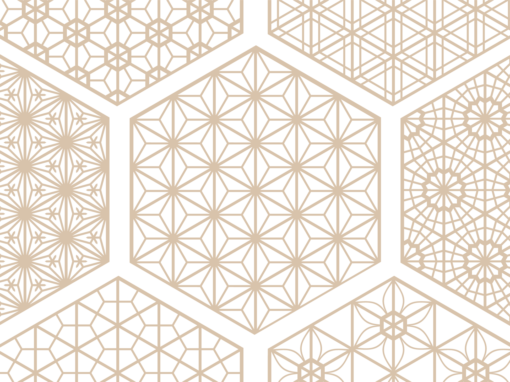 There are hundreds of unique kumiko patterns, each with its own intricate design. Most are based on either a square or hexagonal grid, with hexagonal grids being more popular. Many patterns draw inspiration from nature, reflecting elements like flowers and foliage through geometric representations. This PDF highhlights some examples of a few common patterns.