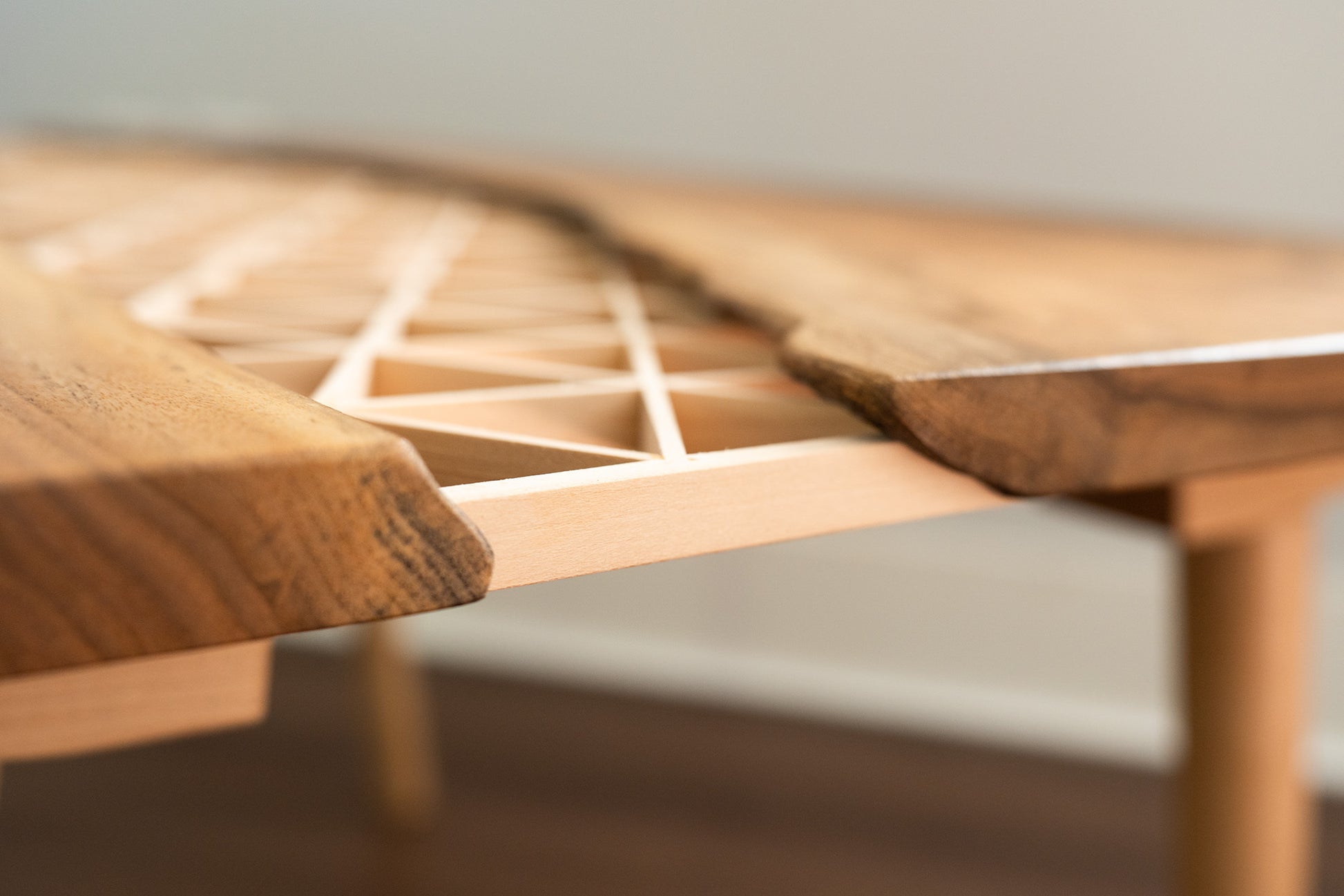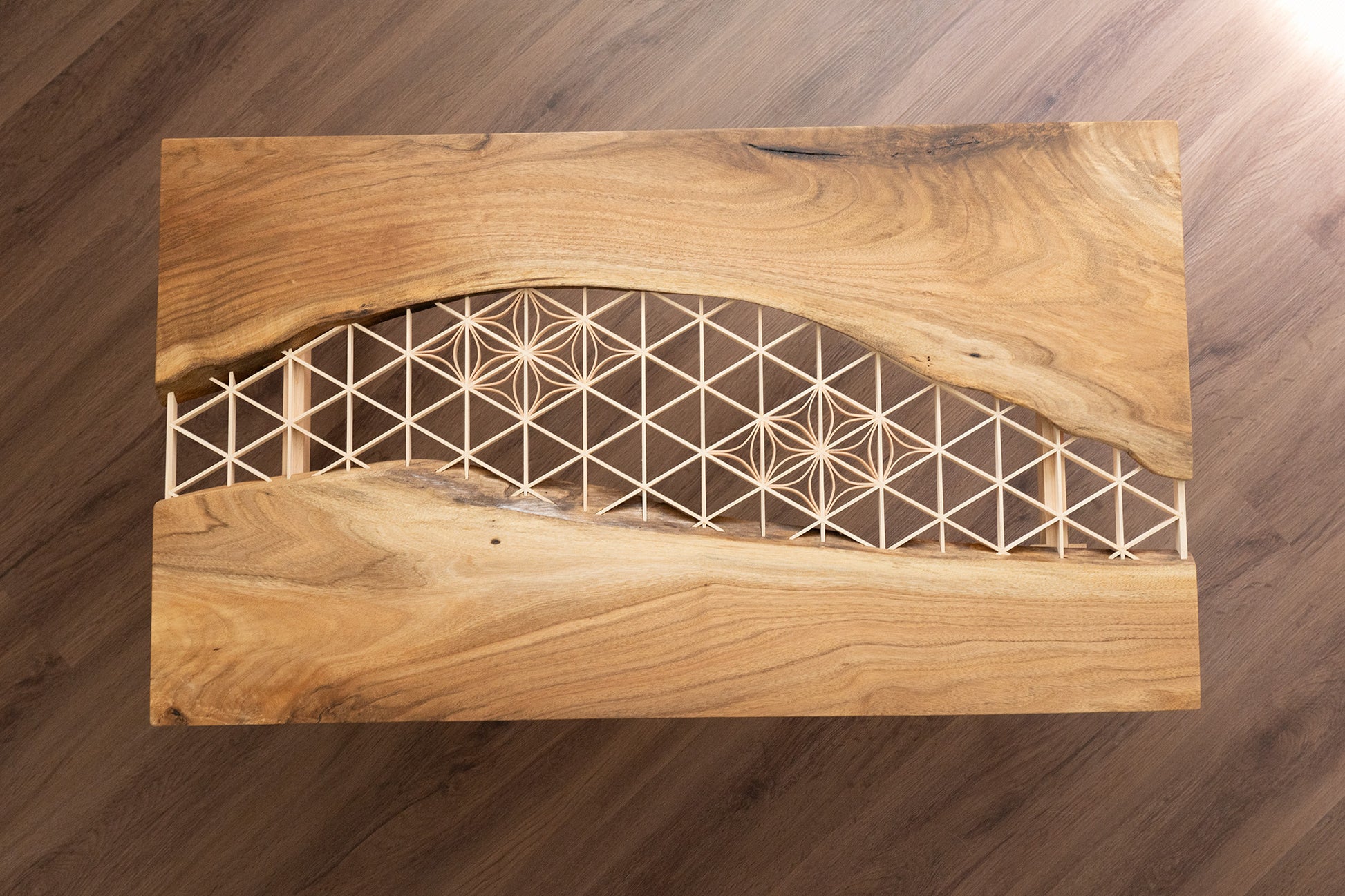 Introduce a touch of nature and elegance to your living space with the Kawa Coffee Table. Crafted from a beautiful elm slab, this table features a stunning kumiko panel running down the center. The intricate shippo pattern, made from premium cedar, adds a unique and artistic flair with a distinct Japanese touch.