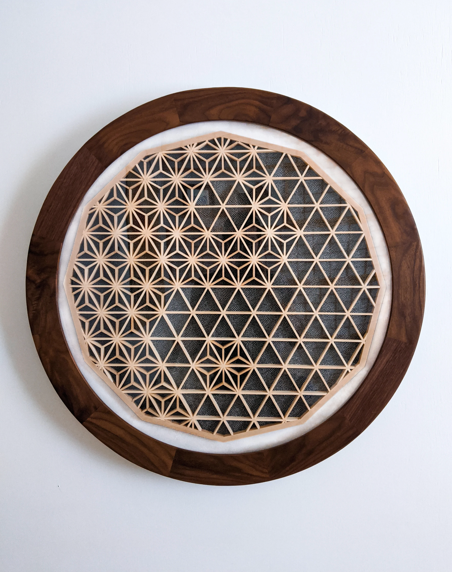 The rich indigo fabric backing provides a stunning contrast to the delicate wooden lattice, while the deep indigo hue brings a sense of tranquility and depth to the piece. The handmade walnut frame further enhances the natural beauty of the art which is elegantly protected behind acrylic, ensuring its preservation while on display. Owning this art piece is not just acquiring a visual delight but also a celebration of natural harmony and exquisite craftsmanship.